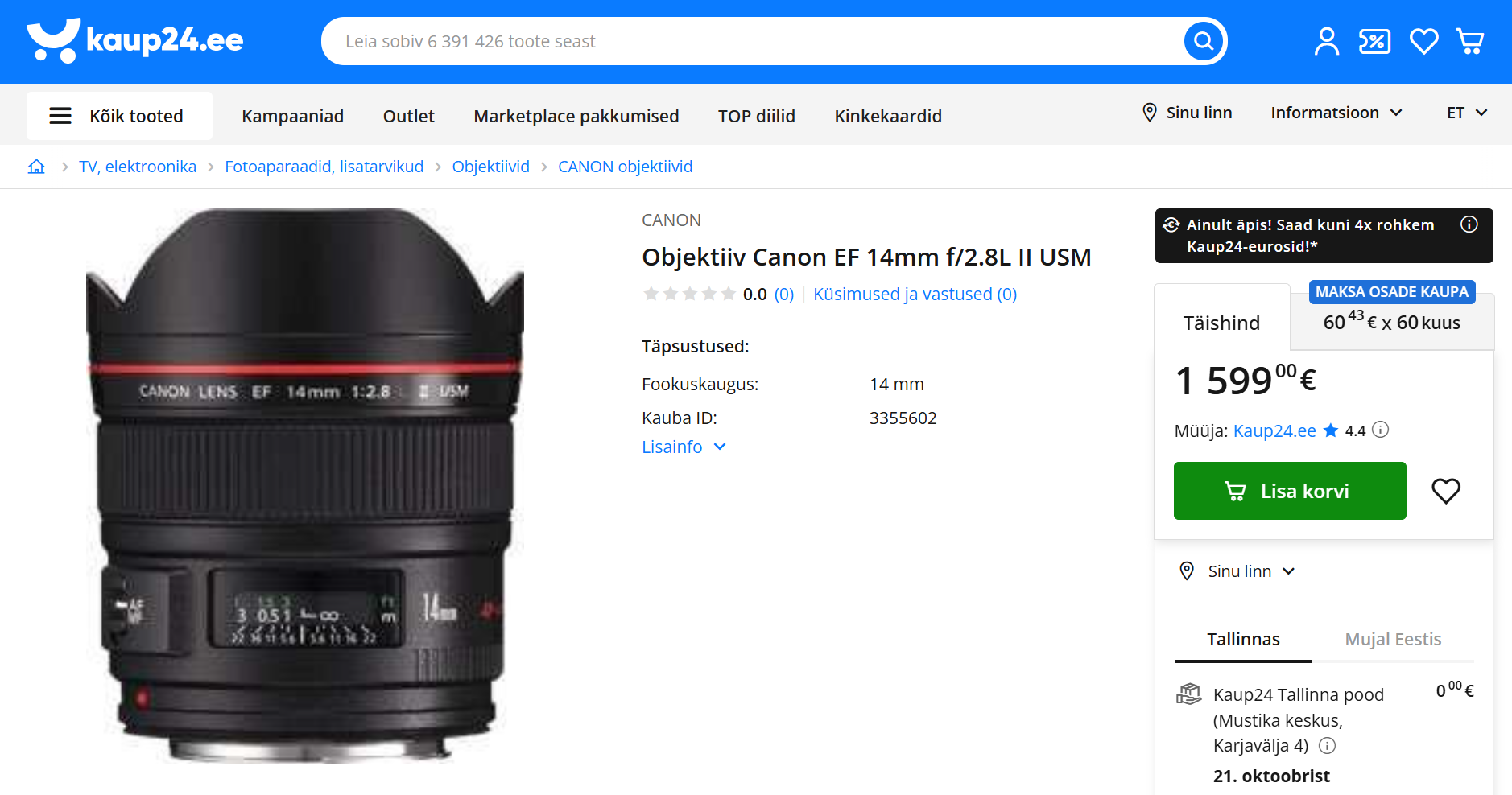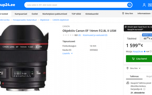 Müüa ülilainurkobjektiiv fiks-objektiiv Canon EF 14mm f/2.8L II USM.