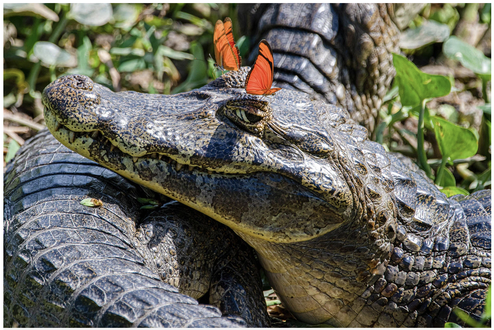 Uudise foto: „Tunnen end armsana, võib-olla kustutan hiljem” – Morris Hersko. Julia liblikad maanduvad tihti kaimani silmadele, et lakkuda soolastes krokodillipisarates leiduvat mineraalaineid. | Nikon Comedy Wildlife Awards 2025